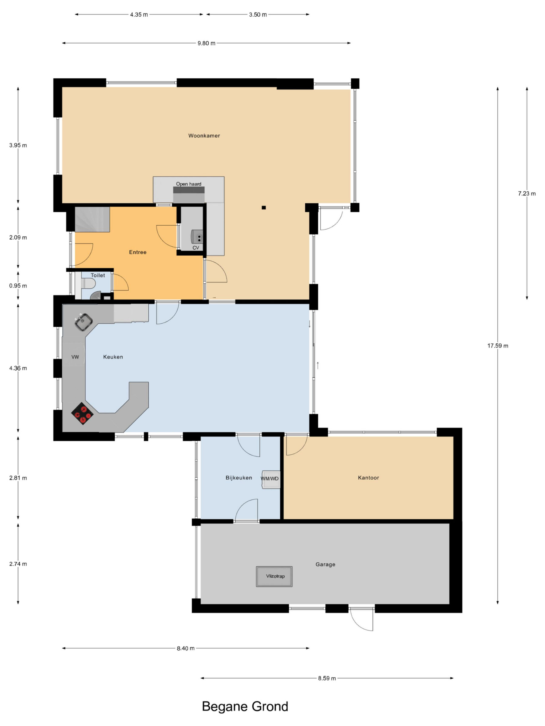 Entree in ruime hal met CV ruimte, toiletruimte en trap naar de eerste verdieping. Vanuit de hal is er toegang tot de woonkamer en de keuken. Beide ruimtes kenmerken zich door veel daglichtinval middels de grote raampartijen. De keuken is voorzien van een inbouw kookplaat, afzuigkap, oven, koel-vriescombinatie en vaatwasser. Vanuit de keuken is de werkkamer en de bijkeuken bereikbaar. De bijkeuken geeft toegang tot de garage.