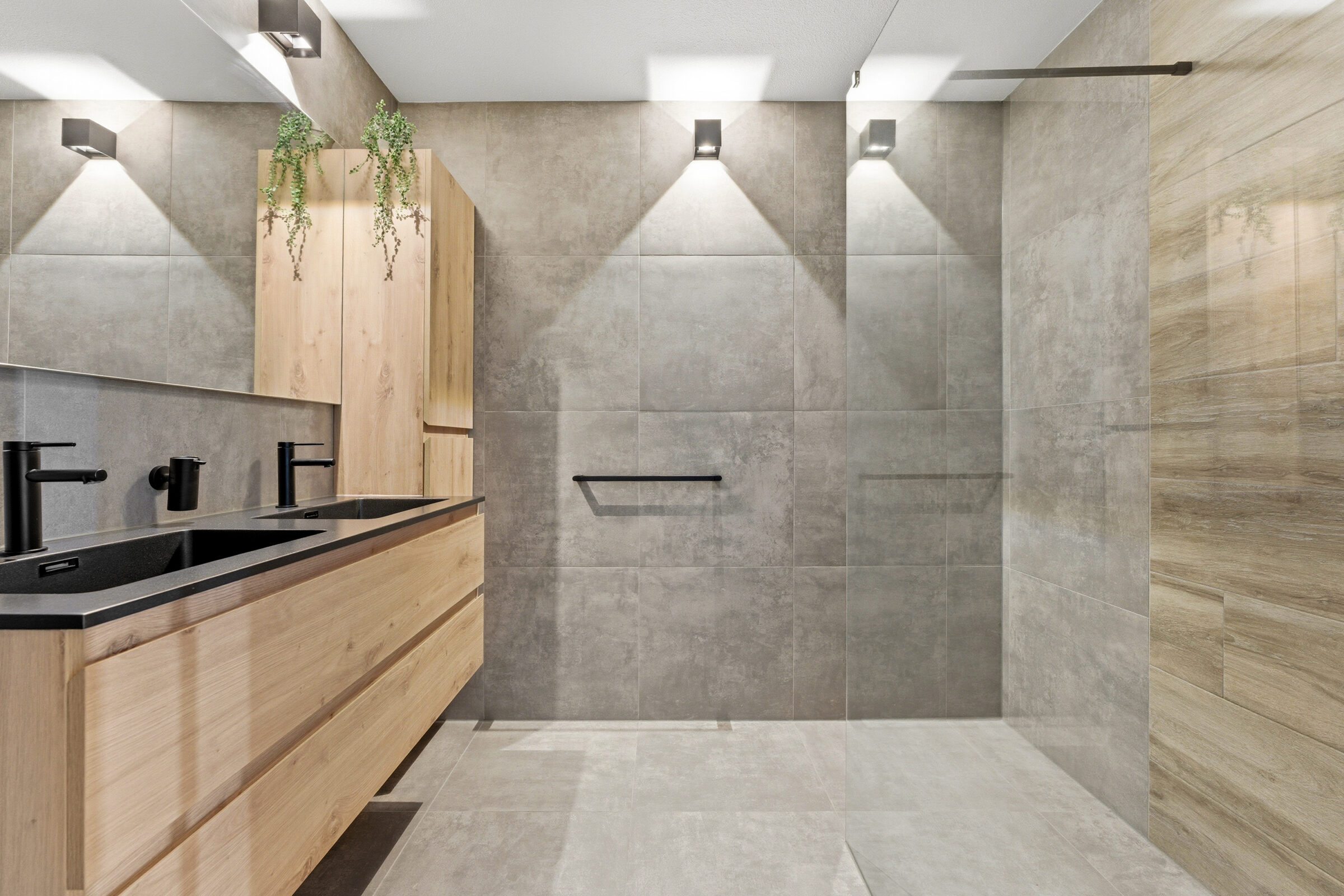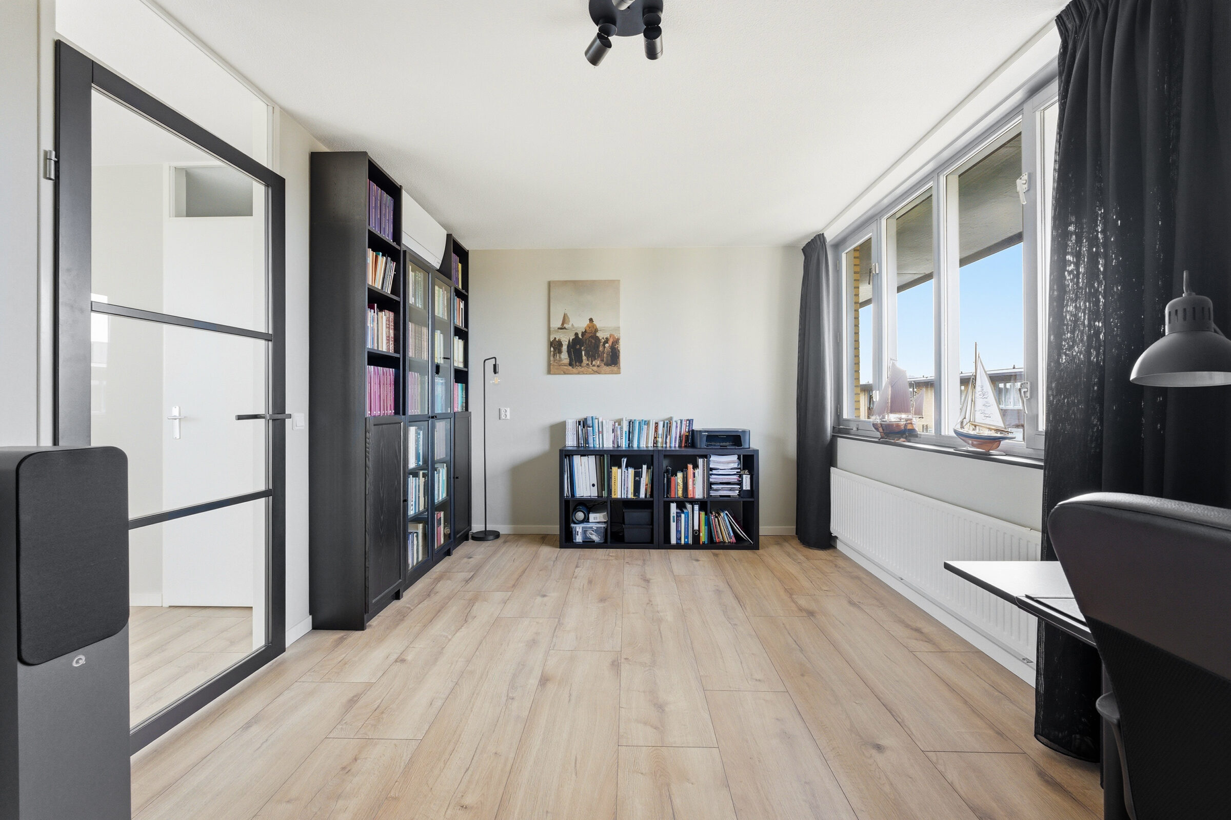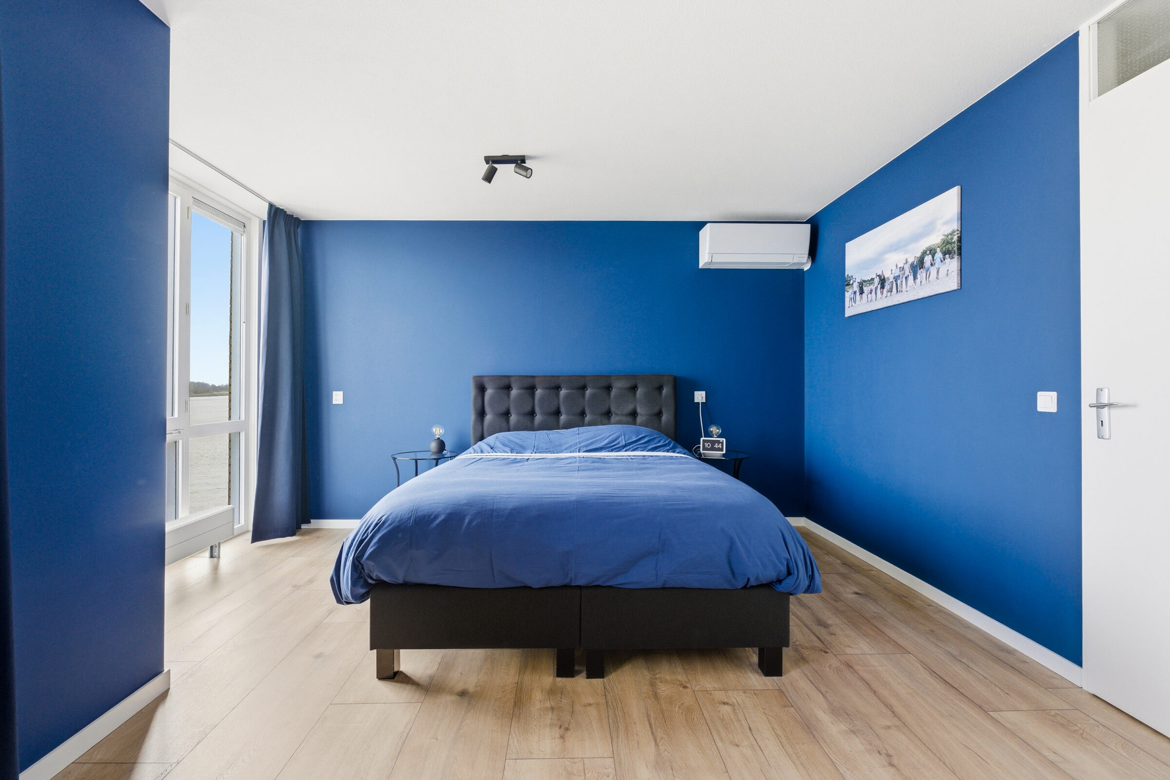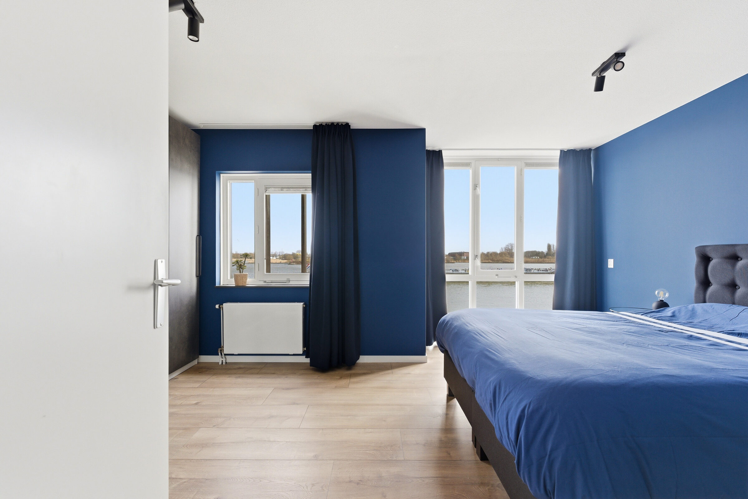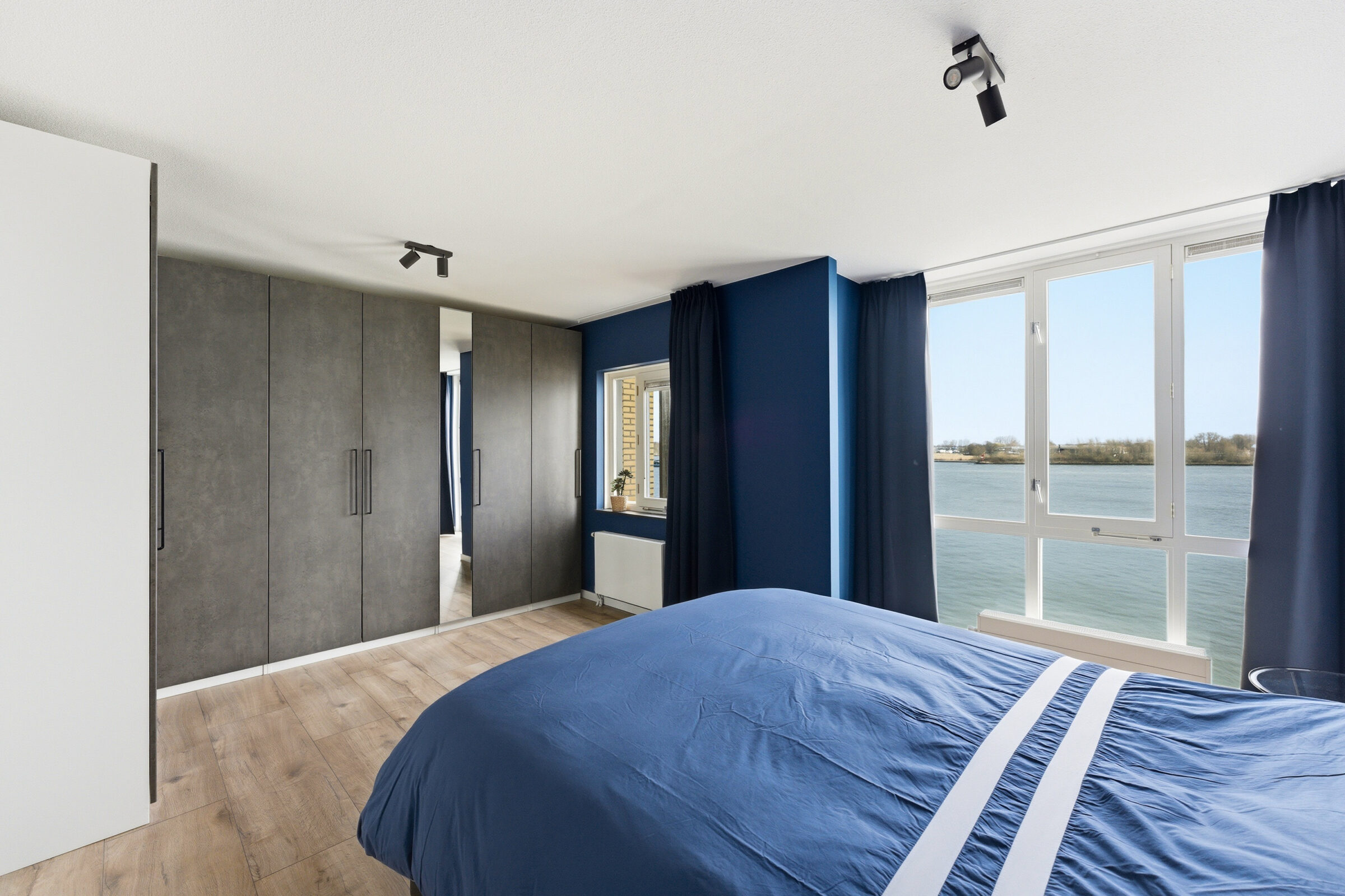 Ruime overloop welke toegang geeft tot de twee slaapkamers, de badkamer, de toiletruimte en een voorraadkast. De masterbedroom aan de waterzijde bestond oorspronkelijk uit twee aparte slaapkamers, dit is weer te realiseren. Deze grote slaapkamer is voorzien van een airco welke zowel koelt als verwarmt. De moderne badkamer is voorzien van een inloopdouche, twee wastafels met prachtig meubel.