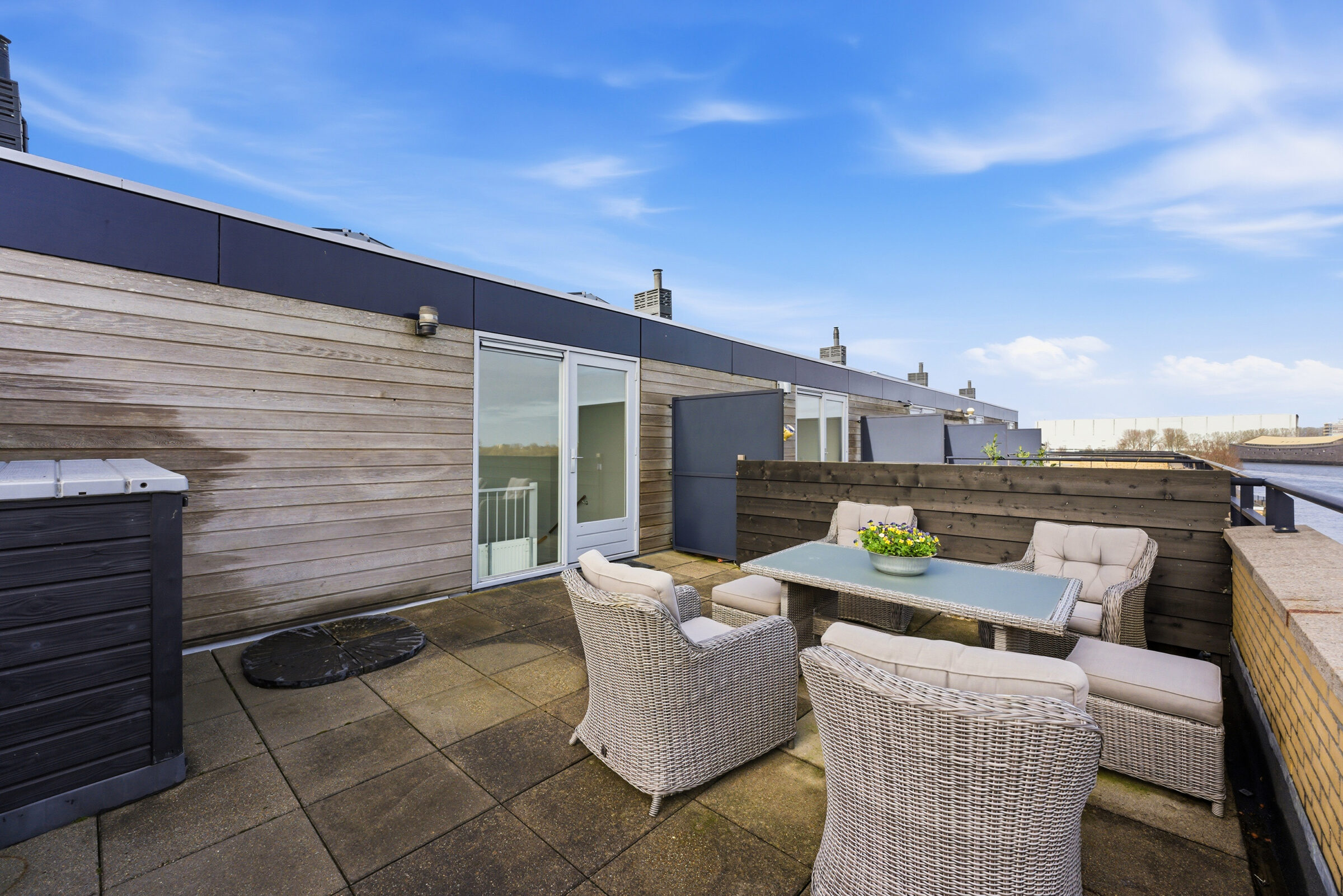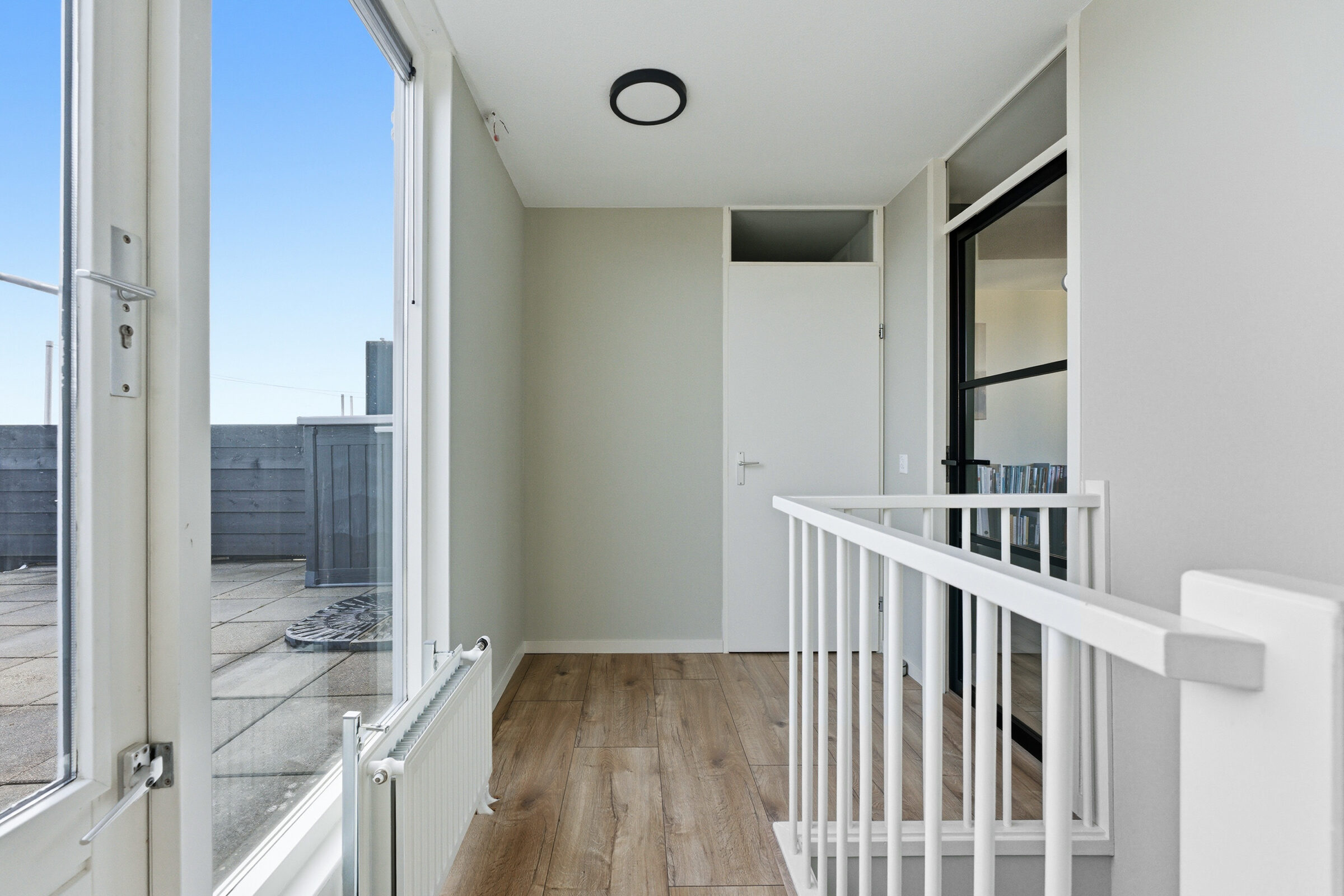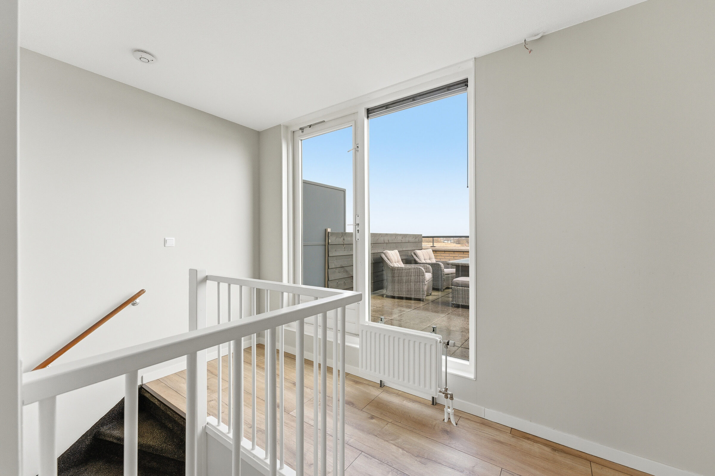 Overloop welke toegang geeft tot het dakterras, de slaapkamer en de technische ruimte. De ruime slaapkamer is voorzien van een airco welke zowel koelt als verwarmt. In de technische ruimte bevindt zich de aansluiting voor de wasapparatuur, de CV installatie, de unit van de mechanische ventilatie en de omvormer van de zonnepanelen. Het royale dakterras heeft een oppervlakte van ca. 25m²! Op het dakterras kunt u vrijwel de hele dag van de zon genieten doordat geen hoogbouw de zon tegen kan houden!