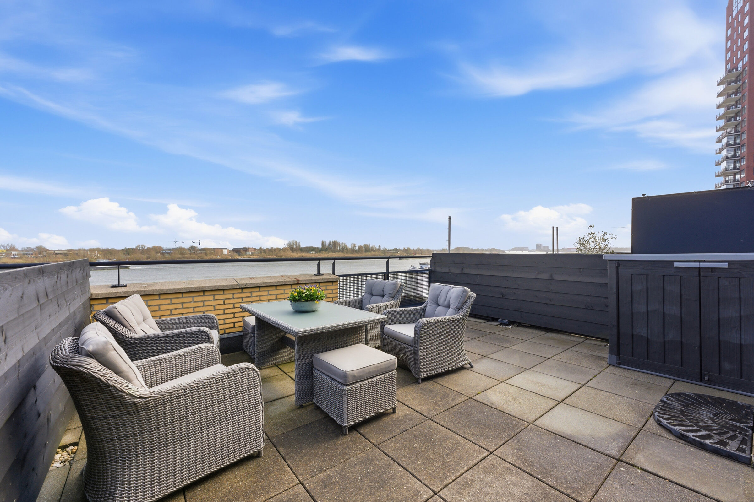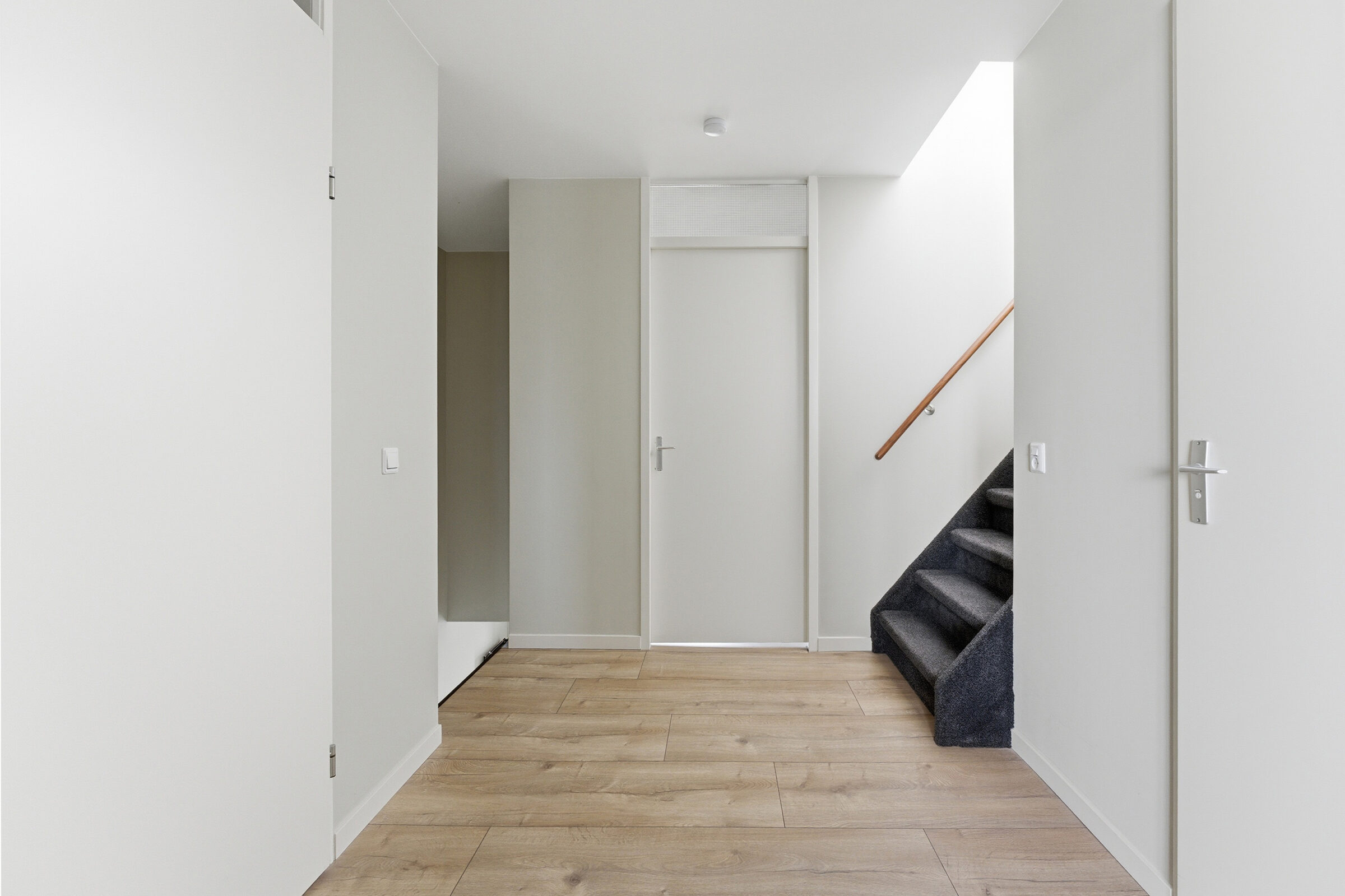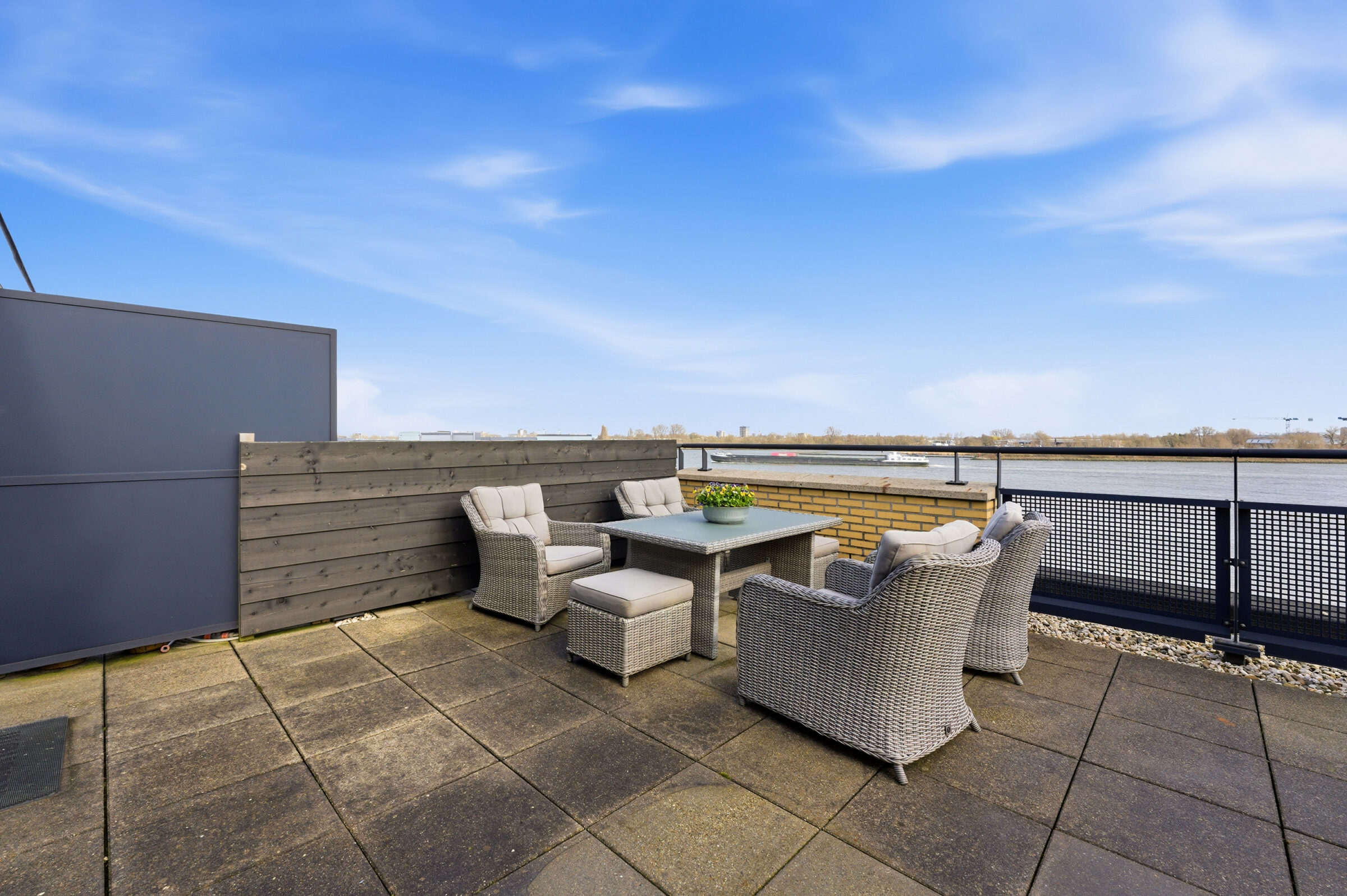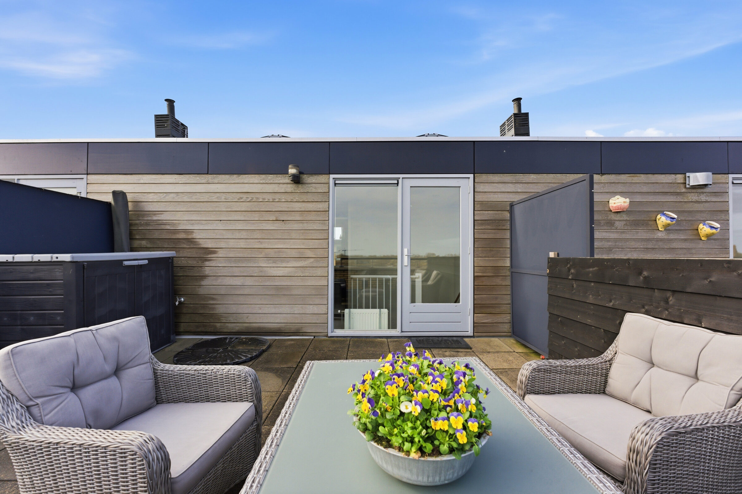 Overloop welke toegang geeft tot het dakterras, de slaapkamer en de technische ruimte. De ruime slaapkamer is voorzien van een airco welke zowel koelt als verwarmt. In de technische ruimte bevindt zich de aansluiting voor de wasapparatuur, de CV installatie, de unit van de mechanische ventilatie en de omvormer van de zonnepanelen. Het royale dakterras heeft een oppervlakte van ca. 25m²! Op het dakterras kunt u vrijwel de hele dag van de zon genieten doordat geen hoogbouw de zon tegen kan houden!