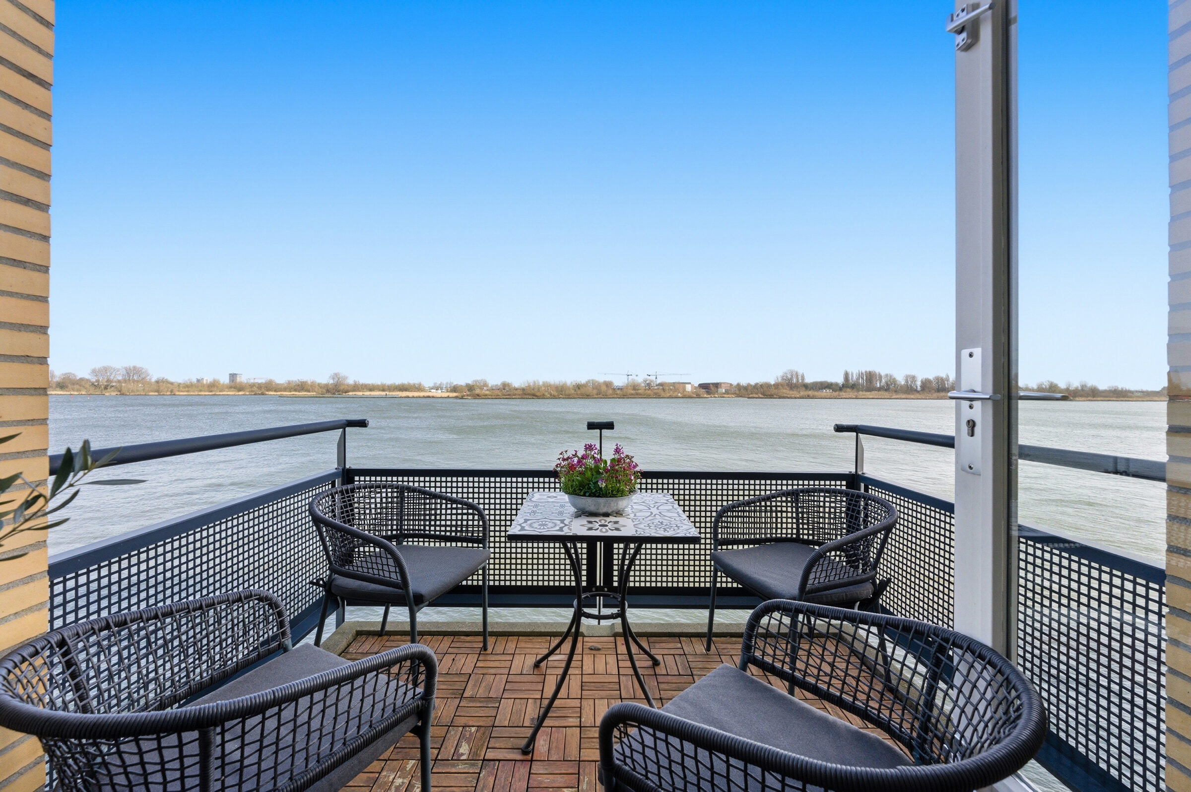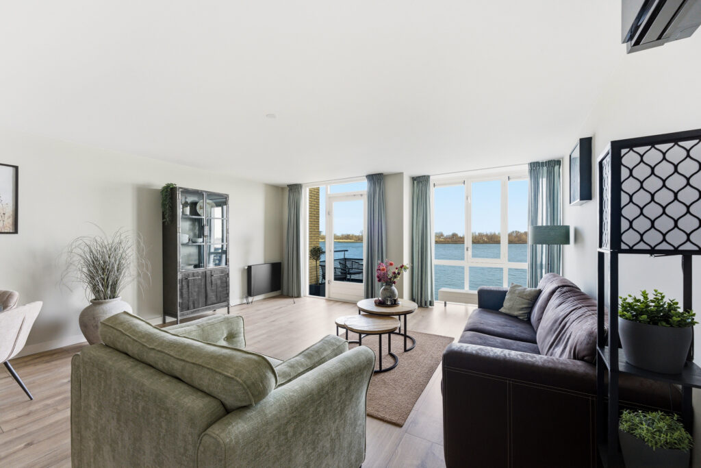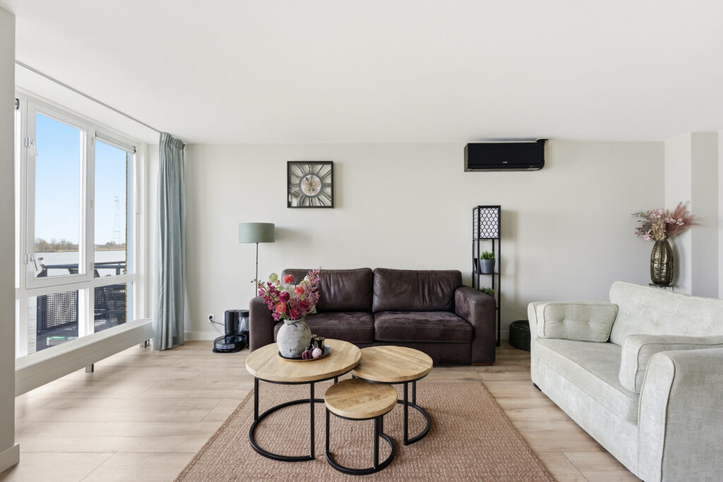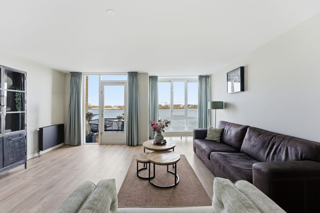 Entree in hal welke toegang geeft tot de woonkamer, toiletruimte, meterkast en trap naar de eerste verdieping. Vanuit de royale woonkamer is er een panoramisch uitzicht over de Nieuwe Maas! De woonkamer geeft toegang tot het balkon, dat is voorzien van houten vlonders. Aan de voorzijde bevindt zich de prachtige keuken met inbouwappartuur van de luxe Studio Line van Siemens. De volgende inbouwapparatuur is aanwezig; vaatwasser, koelkast, vriezer, inductiekookplaat, afzuigkap, oven, magnetron en Quooker. De gehele begane grond is voorzien van vloerverwarming, in de woonkamer is een design airco aanwezig die zowel koelt als verwarmt.