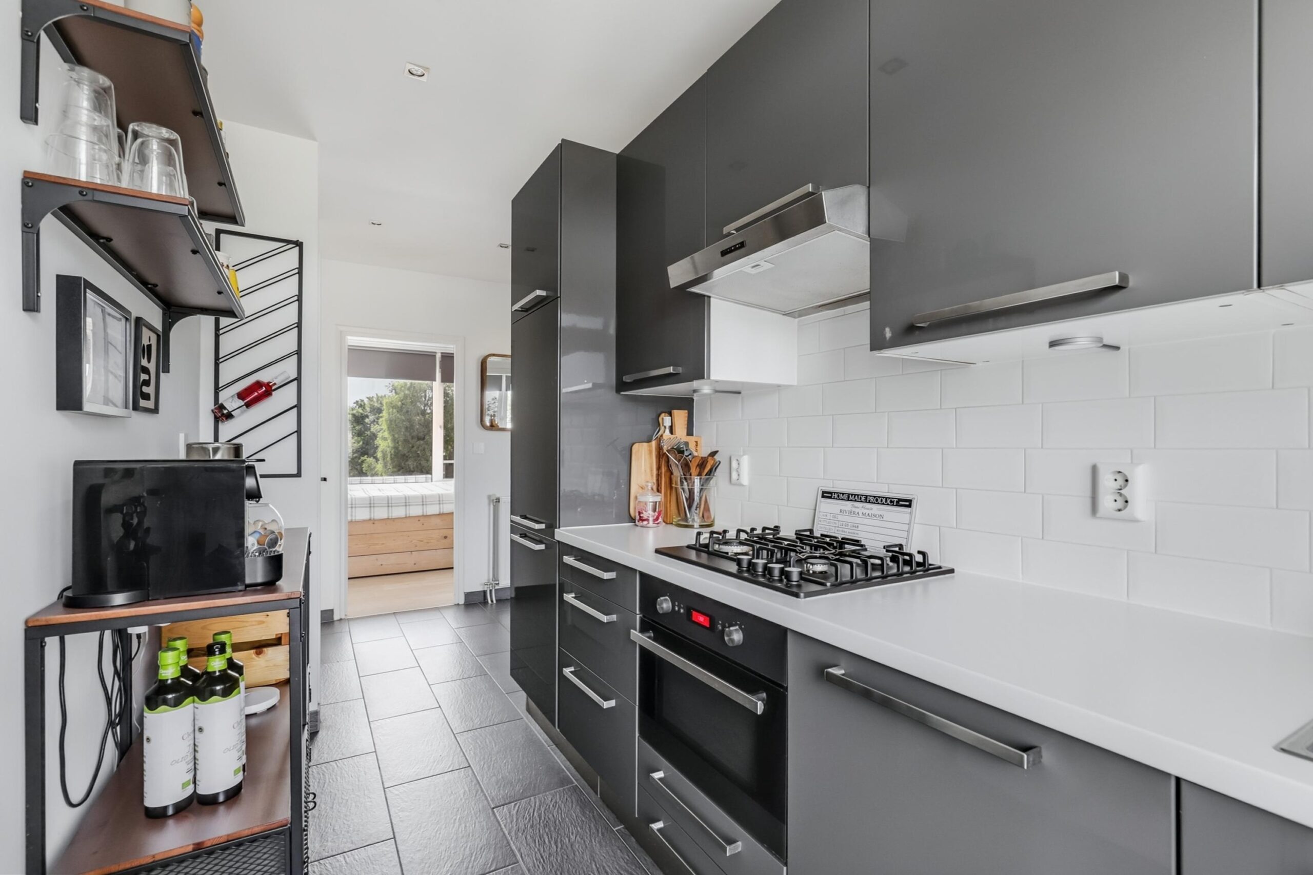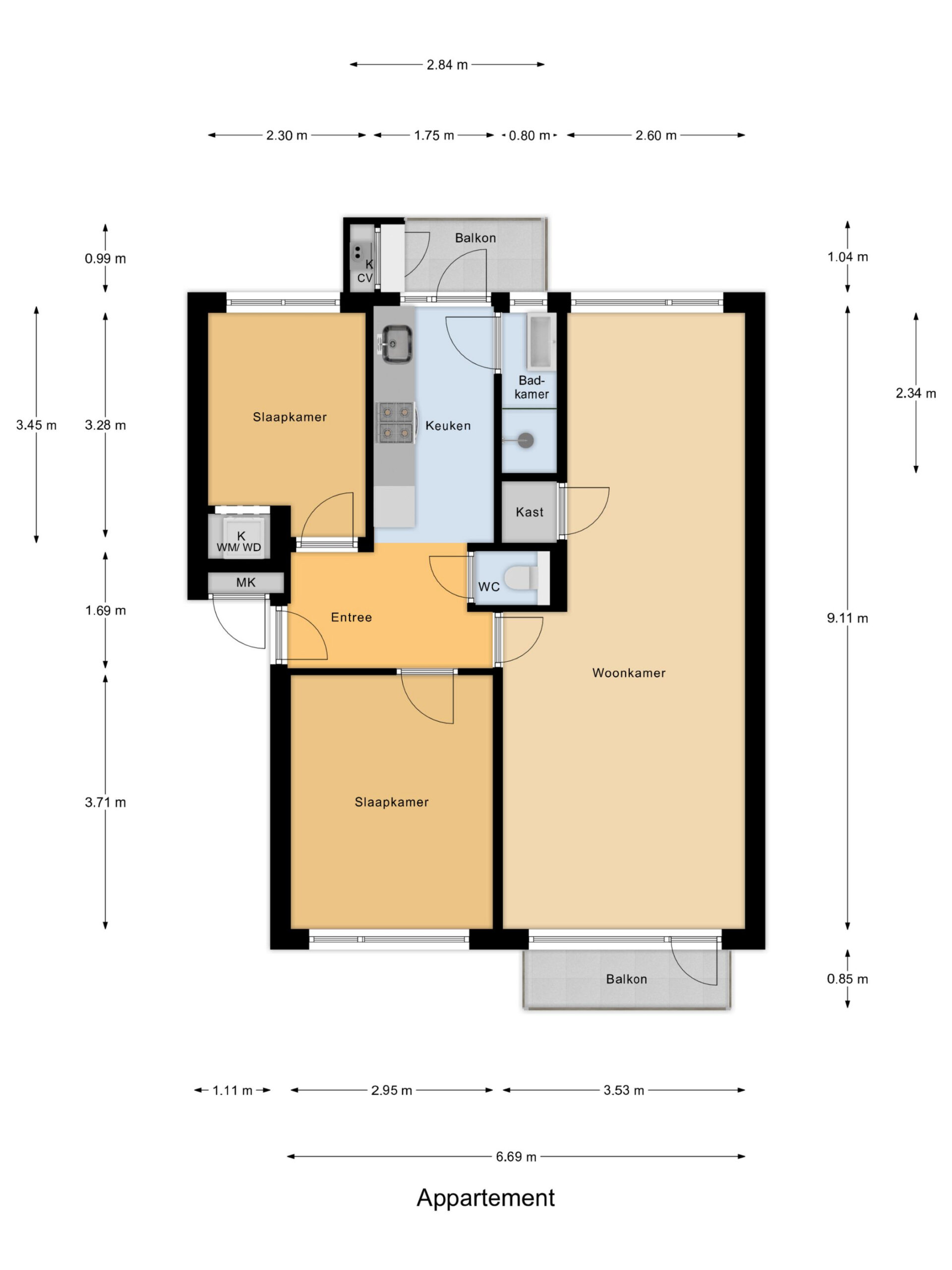 Entree van het appartement. Hal welke toegang geeft tot de twee slaapkamers, de woonkamer en het toilet. Vanuit de hal is er een open verbinding met de keuken. De keuken is voorzien van een inbouw combi- oven, kookplaat, afzuigkap, koel-vriescombinatie en vaatwasser. Vanuit de keuken is de badkamer en het balkon aan de achterzijde bereikbaar. De badkamer is voorzien van een douche en meubel met wastafel. De ruime doorzonwoonkamer geeft toegang tot het balkon aan de voorzijde.