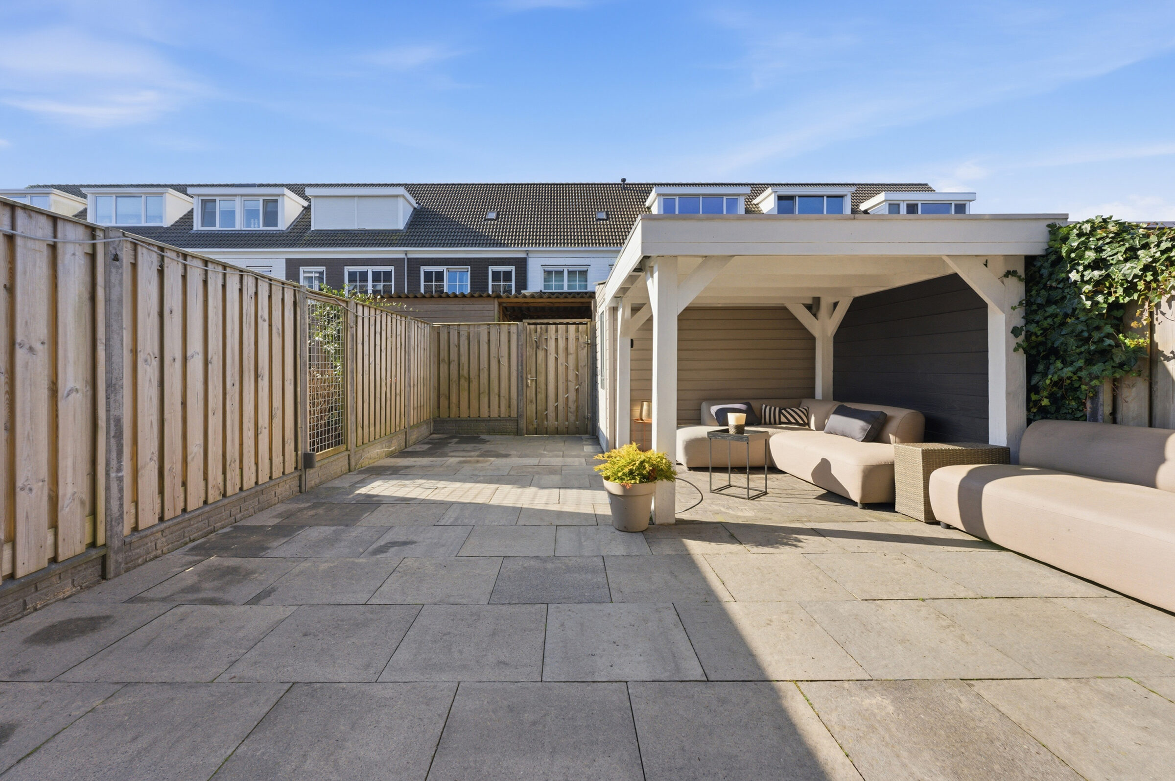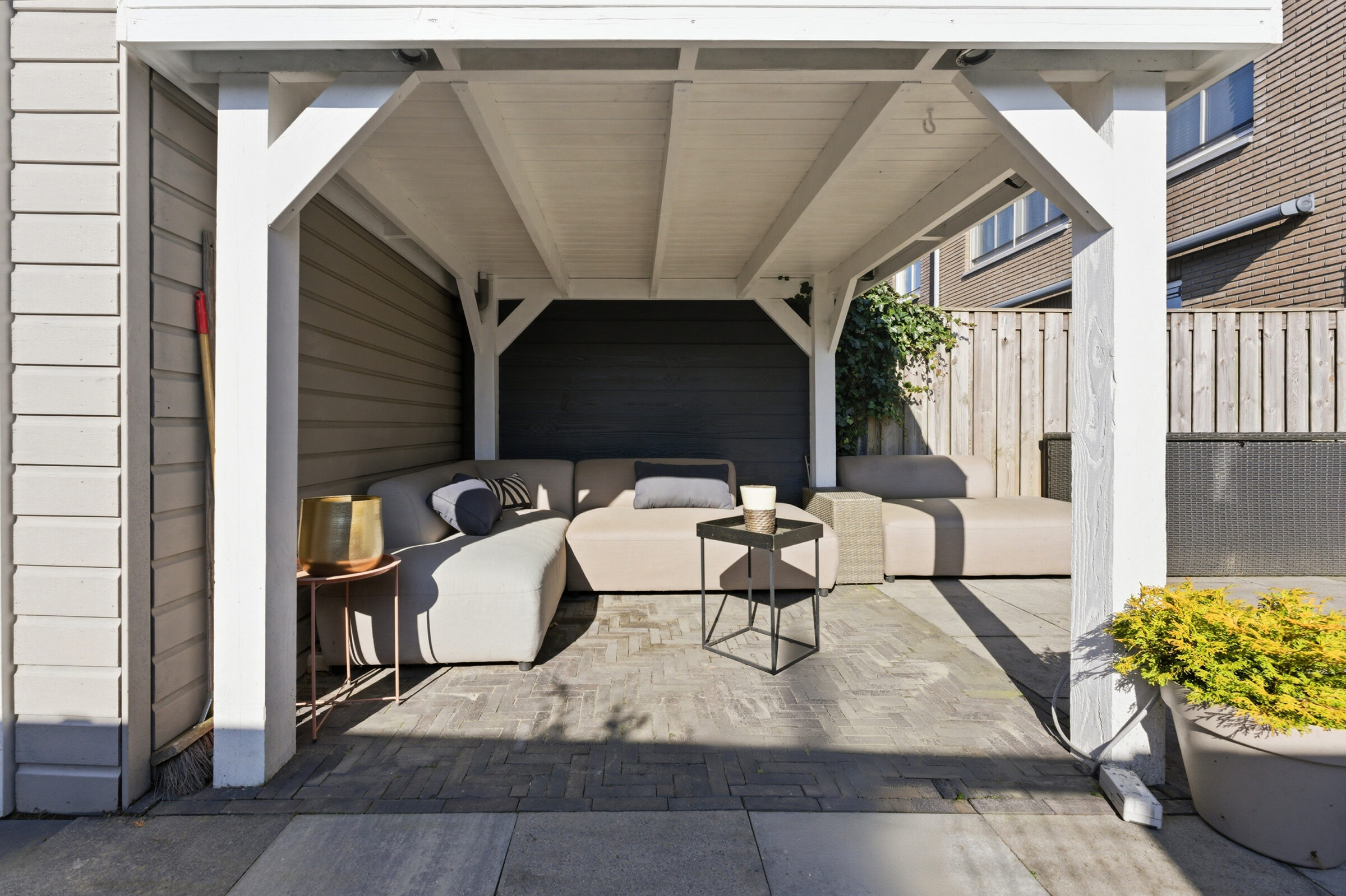 De achtertuin is gelegen op het zonnige zuidwesten en beschikt over een fraaie overkapping, waardoor het een heerlijke plek is om te ontspannen en van het buitenleven te genieten.