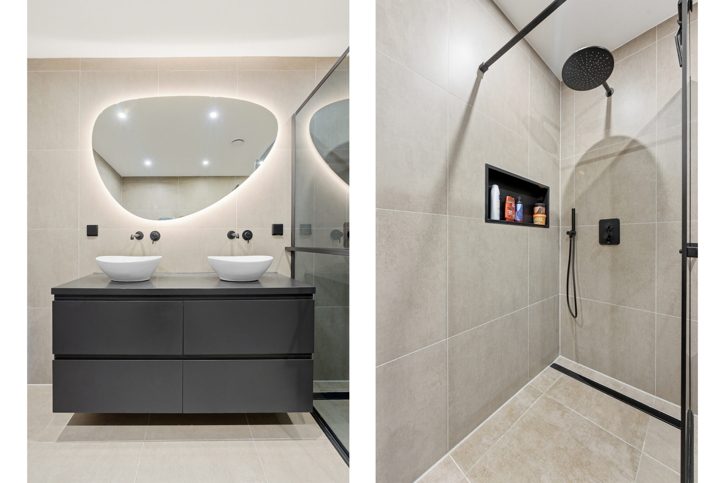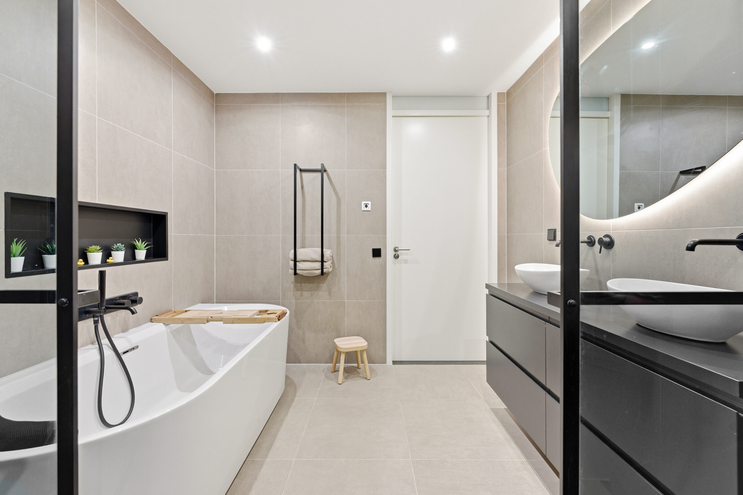 Ook de badkamer (2021) is luxe uitgevoerd en voorzien van een ligbad, dubbele douche en dubbele wastafel, waardoor comfort en ruimte hier centraal staan.